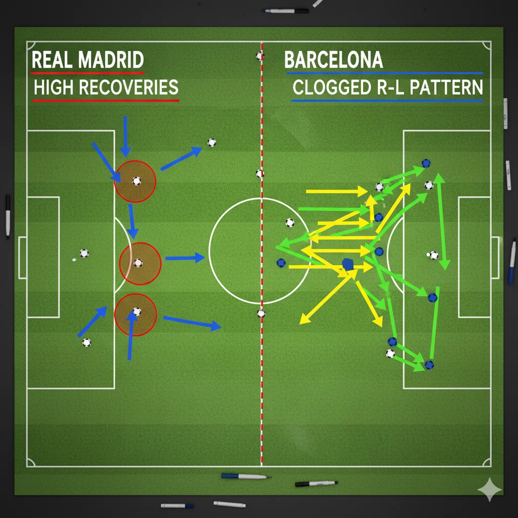 Real Madrid shut down Barcelona’s rhythm. The press clogged preferred circuits, especially the right-to-left pattern Barcelona often uses to finish at the back post. Pedri struggled under the intensity and took a first-half yellow.